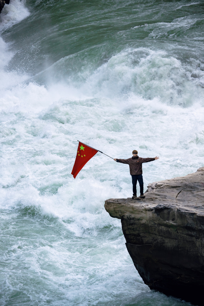网友所称“人生照片”:李现站在发呆石上手举国旗 图据@李现