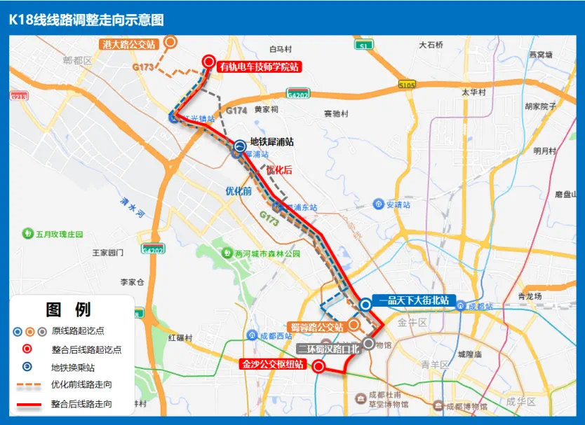 拟整合K18、G173、G174路,整合后线路代码为K18线,线路起讫点调整为有轨电车技师学院站—金沙公交枢纽站,提升犀浦街道周边居民跨区快速通勤体验,市民乘客可在蜀汉路口北、府南新区、金沙公交枢纽站换乘二环快速公交线路。