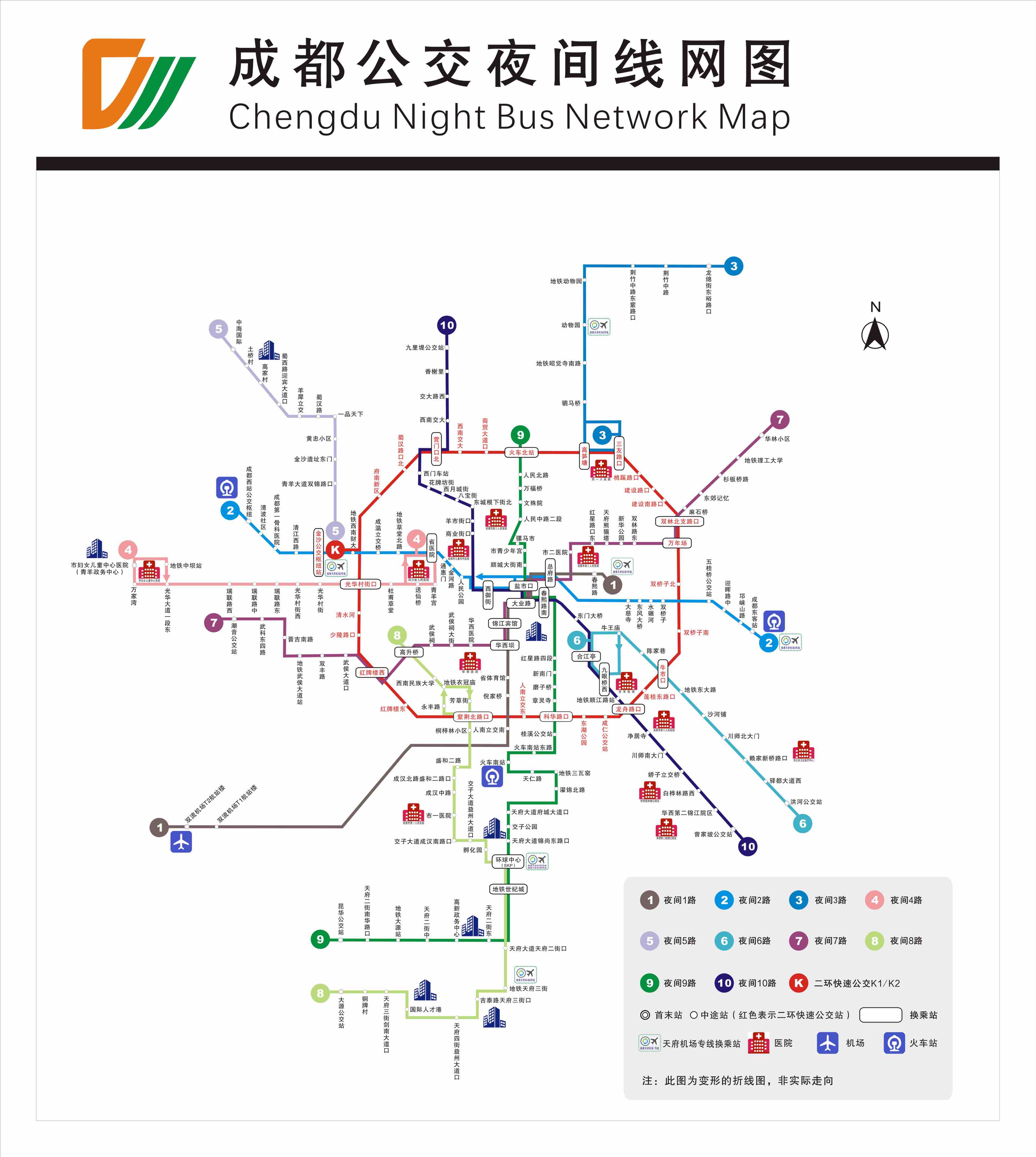 通过“米”字形夜间公交骨架网络,夜间公交调整覆盖南北向、东西向主要客流廊道,服务成都“两场三站”(天府机场、双流机场、成都东站、成都南站、成都西站)交通枢纽,春熙路商圈、华西医院,以及孵化园、软件园等办公区,满足主要客流通道市民夜间出行需求。其中夜间1路、9路通宵运营,其余3条运营时间为22:00-次日00:30,覆盖客流主要出行时段。