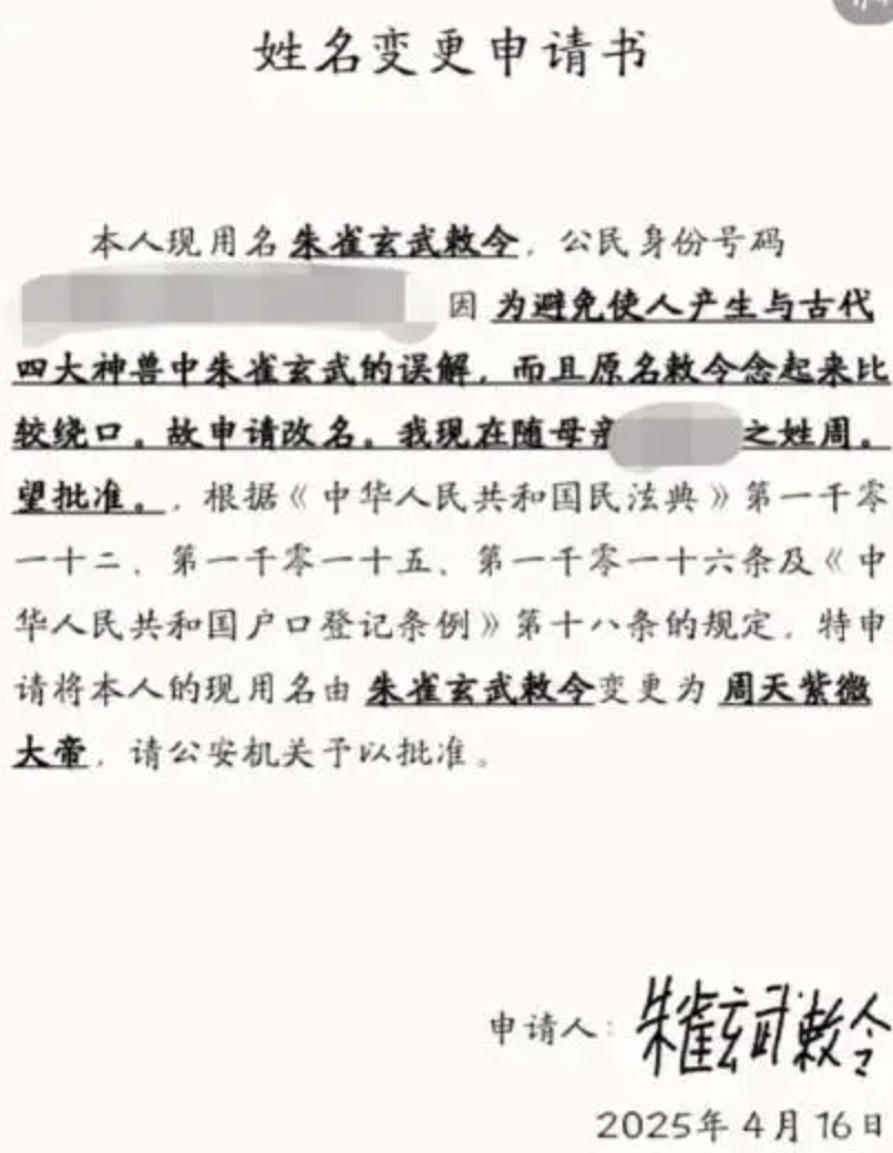近日,有网友发帖称,自己现用名为“朱雀玄武敕令”,因该名易引发误解且拗口,申请随母姓并更名为“周天紫微大帝”,其公布了身份证及姓名变更申请书,引发热议。4月25日,该申请办理状态显示为“不予受理”。