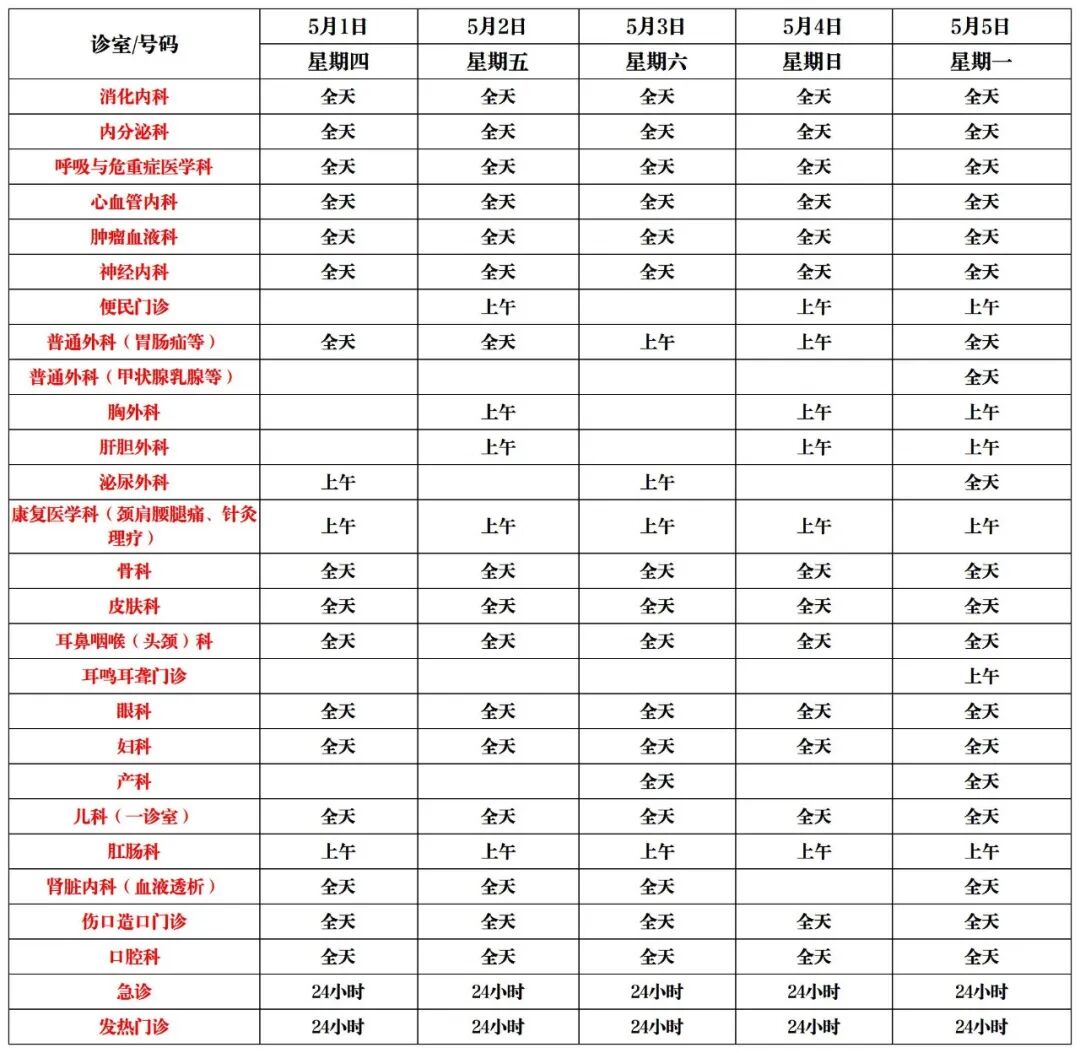5月1日至5月4日(周四至周日)内科开诊,5月5日(周一)全科和皮肤科开诊。