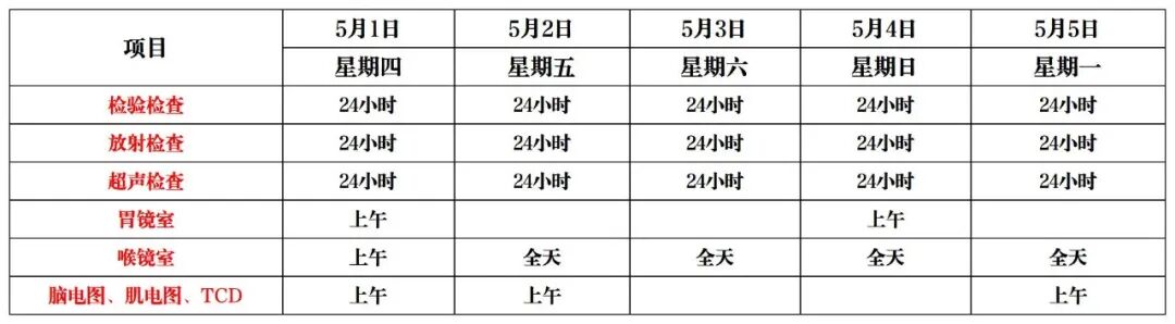 为方便广大患者朋友们就医,五一假期医院门诊、检验检查、放射检查、超声检查均正常上班,急诊、发热门诊24小时开诊,五一假期医院门诊排班安排:(仅供参考,以挂号室当日通知为准)