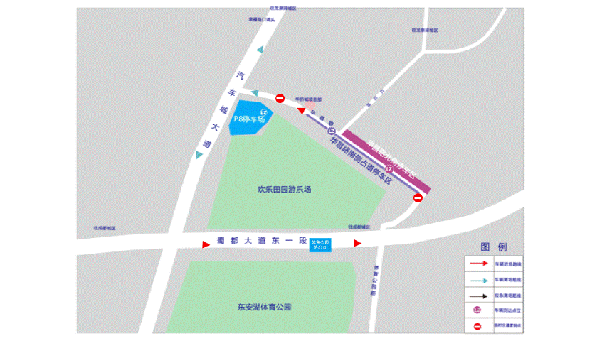 6、汽车城大道三段(欢乐田园路口以北)东侧辅道临时停车区:车头朝北,散场时车辆经汽车城大道→渝蓉高速或成洛大道疏散。