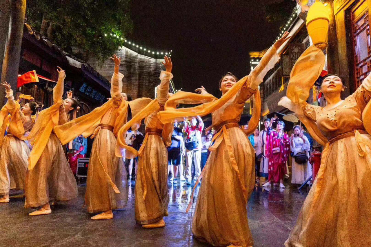该演出以三国文化为根基,依托博物馆园林实景,在武侯祠过厅、琴亭、三义庙广场、三国文化陈列室前、惠陵照壁前等多个点位轮番呈现歌舞、古风器乐、杂技和情景朗诵等多元形式的表演。《夜映武侯》以红墙竹影、亭台楼榭为舞台背景,用月光清风为伴奏,完美呈现“游艺三国不夜天”的奇幻场景。