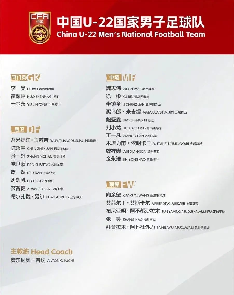 此外,成都蓉城球员木塔力甫·依明卡日入选本期中国U-22国家男子足球队名单,将在5月23日至6月10日赴辽宁省大连市组织集训并出访白俄罗斯参加友谊赛。