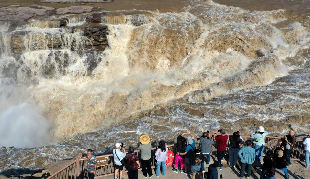 连日来,受黄河中游汛期降雨影响,位于山西吉县和陕西宜川县交界处的黄河壶口瀑布水量增加,出现黄色瀑布群景观。奔腾的河水如同脱缰之马,呼啸而下,吸引大量游客前来观赏。