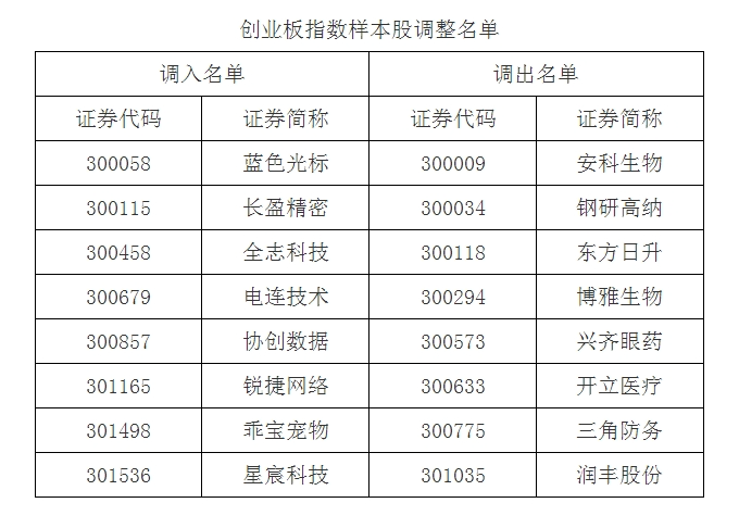 创业板指样本股调整名单中,调入蓝色光标、长盈精密、全志科技、电连技术、协创数据、锐捷网络、乖宝宠物和星宸科技8只个股,调出安科生物、钢研高纳、东方日升、博雅生物、兴齐眼药、开立医疗、三角防务和润丰股份8只个股。