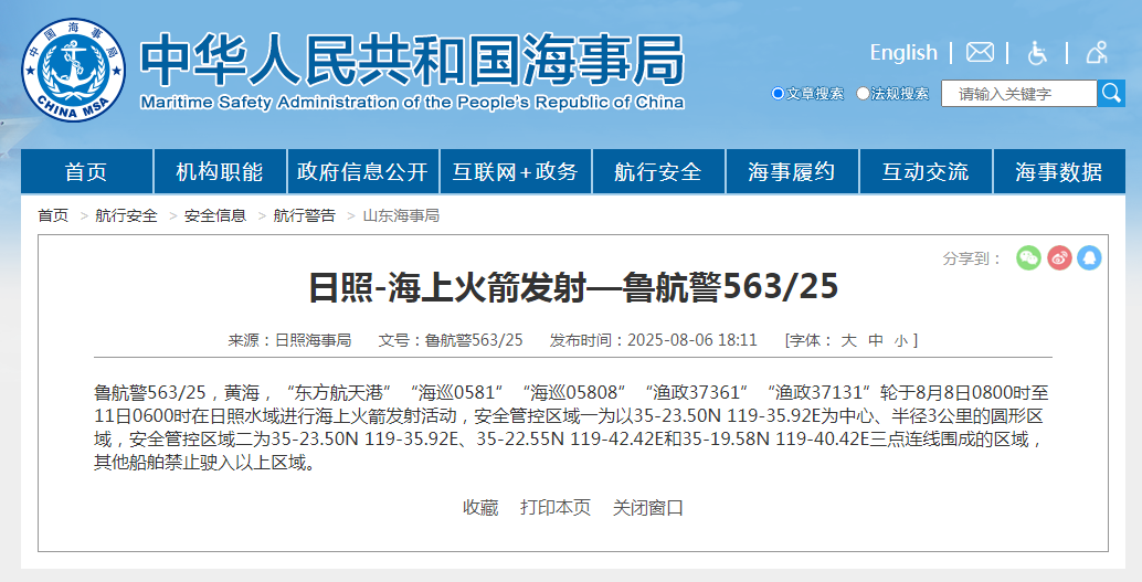 据中国海事局网站消息,日照海事局发布航行警告,8月8日8时至11日6时,在日照水域进行海上火箭发射活动,其他船舶禁止驶入部分区域。