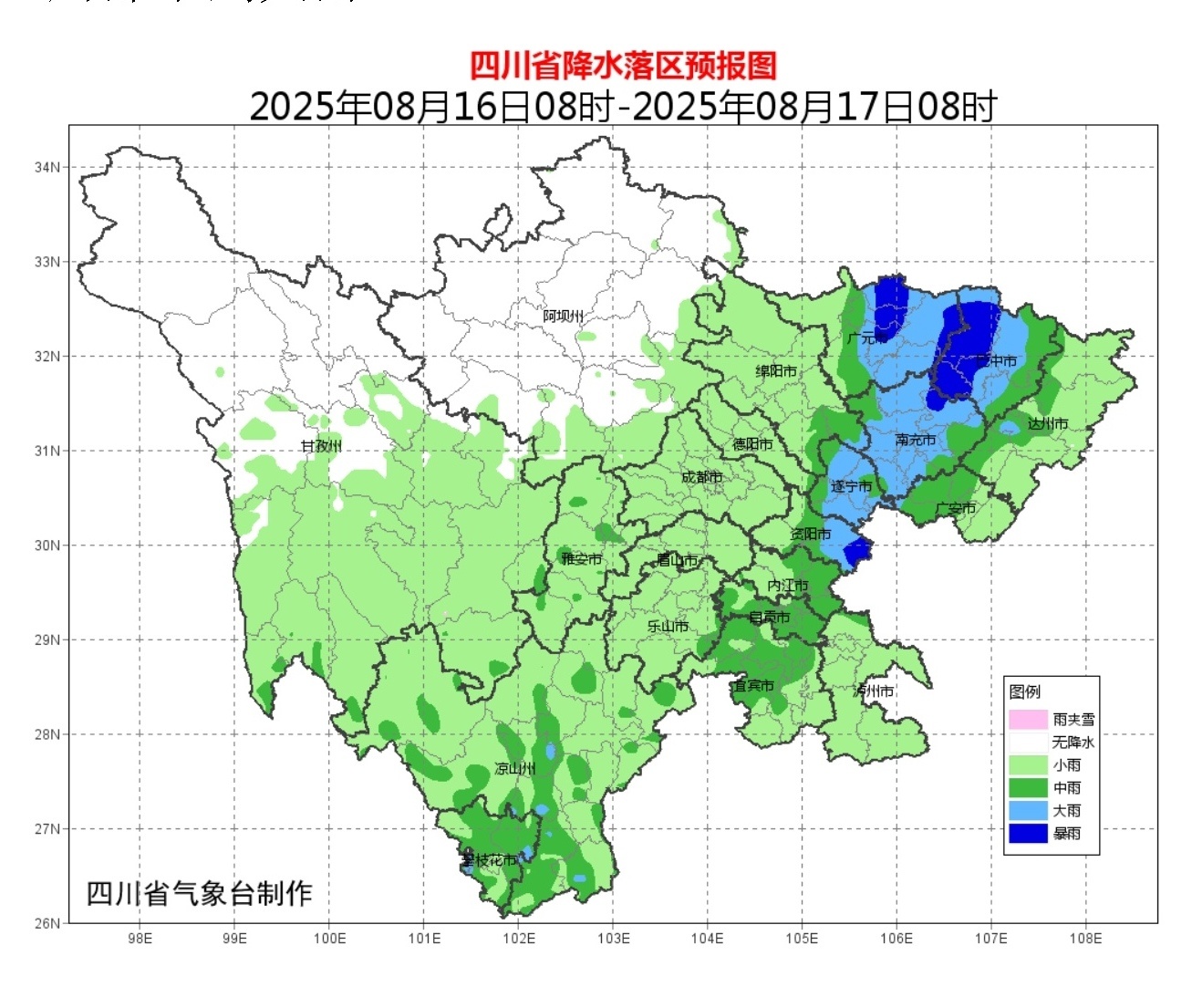 预计16日白天到晚上:盆地大部阴天间多云有雷雨或阵雨,东部、南部的部分地方有中到大雨,局部暴雨,雷雨时伴有短时阵性大风;川西高原北部多云间晴,川西高原其余地方和攀西地区多云间阴有雷雨或阵雨,局部中到大雨。