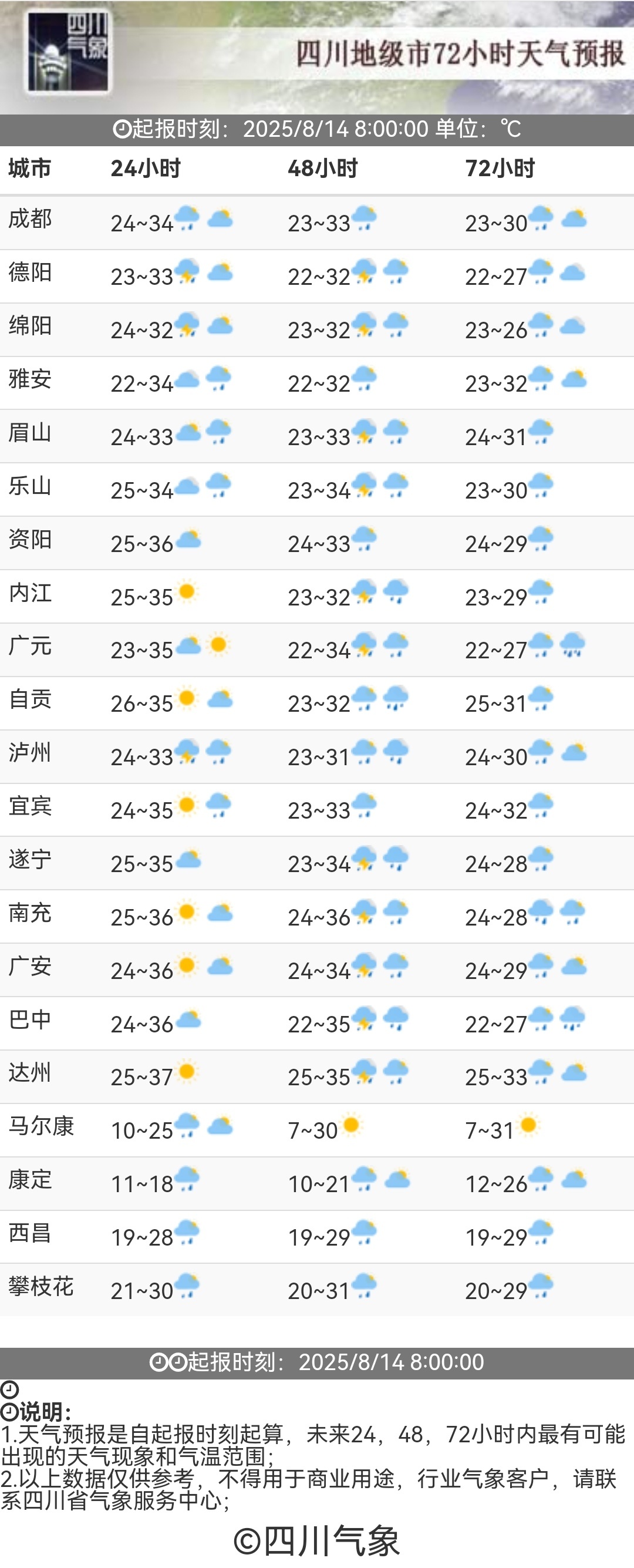 根据今天早间中央气象台和四川省气象台的预报:今天(8月14日)盆地还是有点热,各城市气温跟昨天相差不多,明天气温有所下降。等到周末休息日,成都、德阳、绵阳等部分盆地城市的日最高气温将降到30℃以下。
