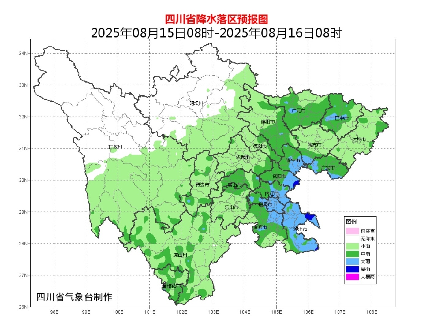 四川省气象台预计,15日白天到晚上,盆地大部多云转阴有雷雨或阵雨,部分地方有中雨,其中宜宾、泸州、自贡、内江、资阳、遂宁、广安7市的部分地方有大雨,个别暴雨,雷雨时伴有短时阵性大风;川西高原北部多云间晴,川西高原其余地方和攀西地区多云间阴有雷雨或阵雨,局部中雨。