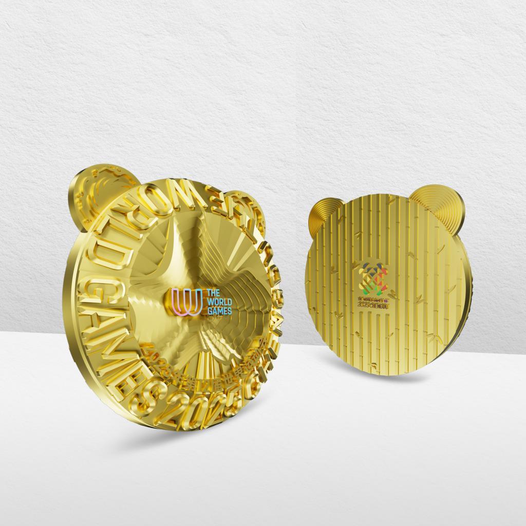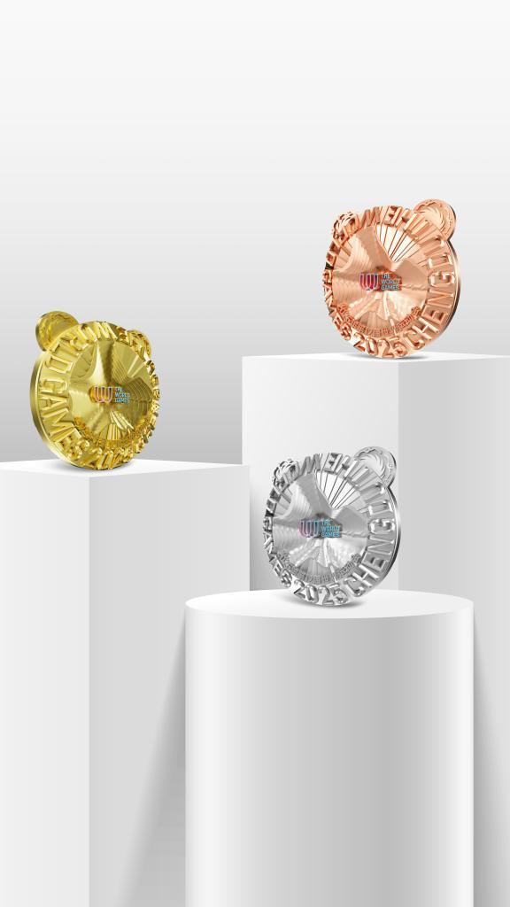 奖牌命名“竹光”谐音“逐光”。其造型摒弃了传统综合运动会奖牌的纯圆形制式,灵感源自吉祥物大熊猫“蜀宝”的头部轮廓。顶部醒目的“熊猫耳”设计不仅具有高辨识度,更巧妙融入了太阳神鸟纹饰,将成都的城市符号与体育精神紧密结合。