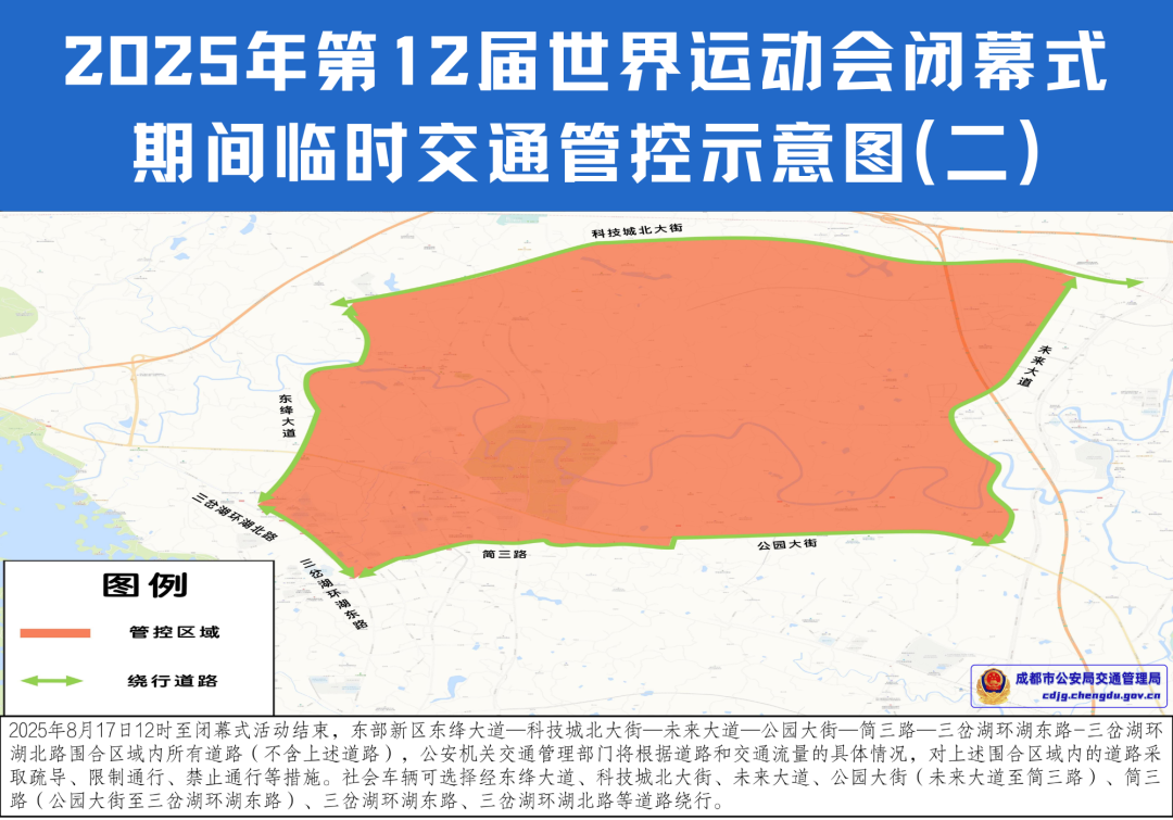 二、2025年8月17日12时至闭幕式活动结束,东部新区东绛大道—科技城北大街—未来大道—公园大街—简三路—三岔湖环湖东路—三岔湖环湖北路围合区域内所有道路(不含上述道路),公安机关交通管理部门将根据道路和交通流量的具体情况,对上述围合区域内的道路采取疏导、限制通行、禁止通行等措施。社会车辆可选择经东绛大道、科技城北大街、未来大道、公园大街(未来大道至简三路)、简三路(公园大街至三岔湖环湖东路)、三岔湖环湖东路、三岔湖环湖北路等道路绕行。