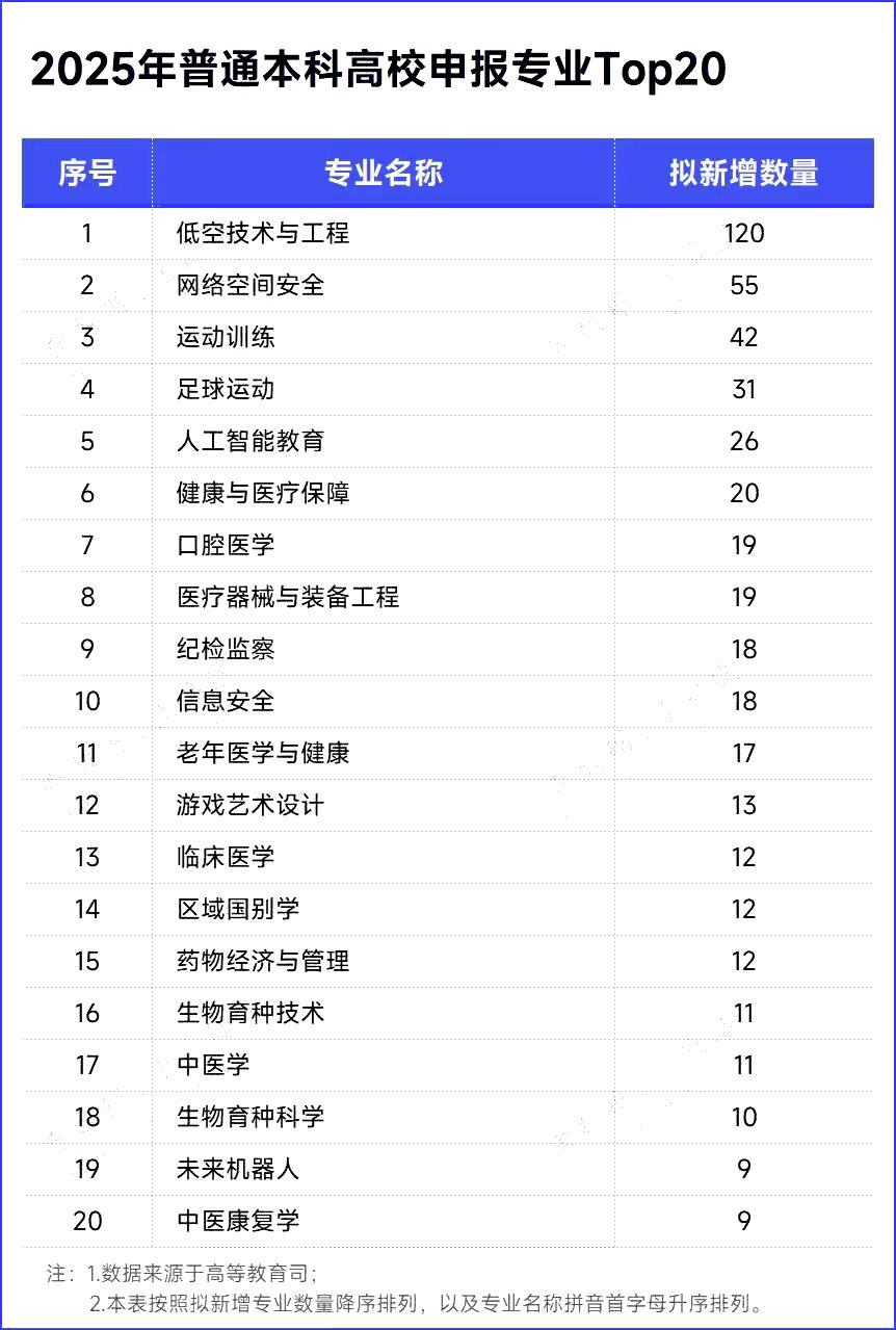 经统计,本次申报专业拟新增863个。从申报的专业类型来看,2025年度共申报239种专业。其中,低空技术与工程拟新增数量最多,为120个;网络空间安全次之,拟新增数量为55个。