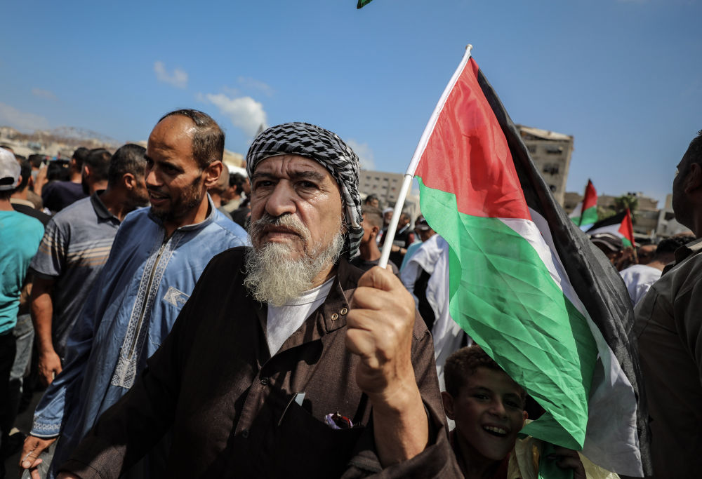 8月21日,数百名巴勒斯坦人聚集在加沙城的市中心,要求以色列停止战争和驱逐平民,呼吁国际社会保护加沙平民。新华社发(里泽克·阿卜杜勒贾瓦德摄)