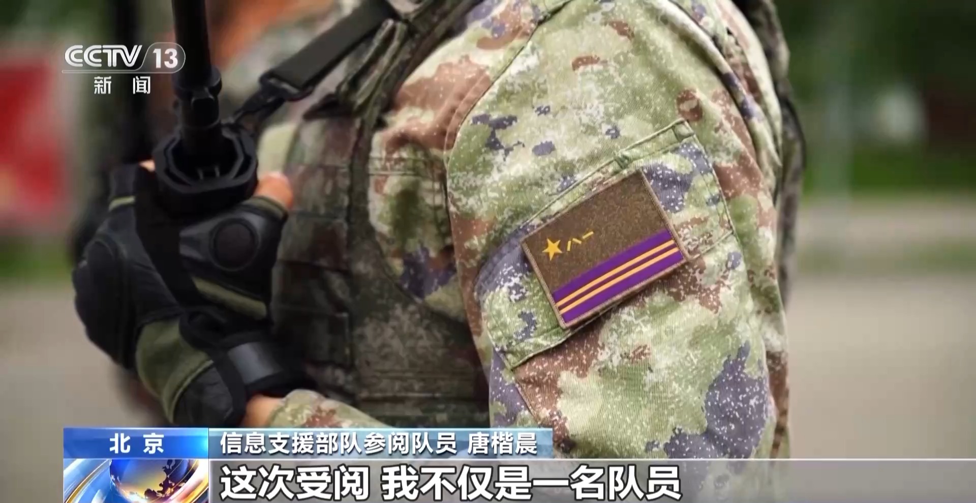 信息支援部队参阅队员 唐楷晨:佩戴着新的兵种军旗臂章再次参加受阅,我感到无上的光荣和归属感。这次受阅,我不仅是一名队员,更是一名教练员。这就要求我不仅自身动作要标准过硬,更要把我的训练方法和经验传递给每名队员。与大家一起并肩走过天安门。