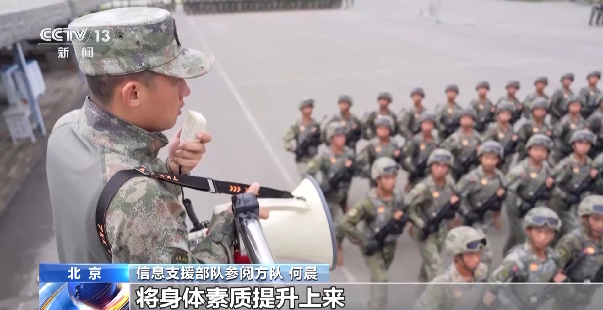 信息支援部队参阅方队 何晨:信息支援部队的战士们能够沉下心来,耐得住寂寞。同时,他们的学习和适应能力特别强。经过我们科学的组训,将身体素质提升上来。如今,在每一次的考核评比当中,我们都名列前茅。