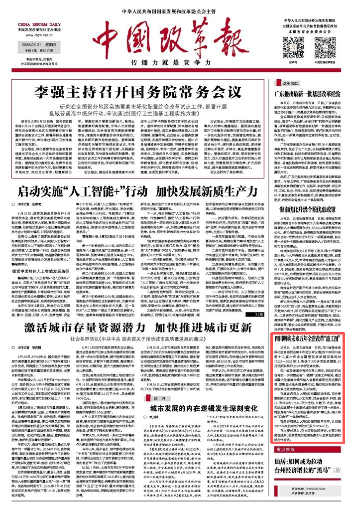 日前,四川省委全面深化改革委员会第十次会议审议通过《中共四川省委十二届六次全会重要改革举措实施规划(2025—2029年)》,明确了300多项改革措施,以及预期取得的2500余项改革成果。