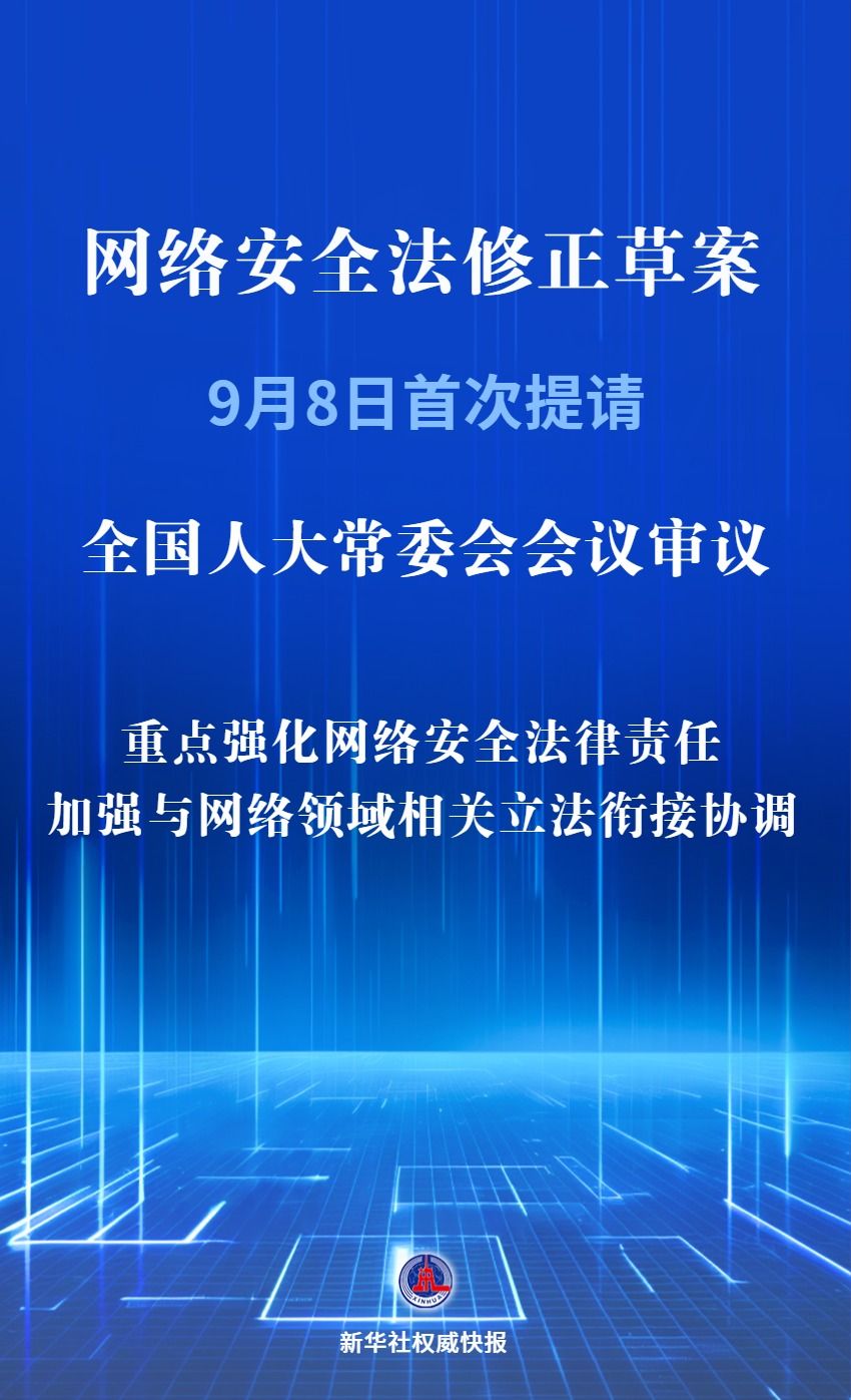 网络安全法是网络安全领域的基础性法律。9月8日,网络安全法修正草案首次提请全国人大常委会会议审议。此次修改坚持问题导向,重点强化网络安全法律责任;坚持体系化衔接,加强与数据安全法、个人信息保护法、行政处罚法等相关法律有机衔接;坚持分类施策,科学设置网络运行安全、网络信息安全等不同类型违法行为的法律责任。