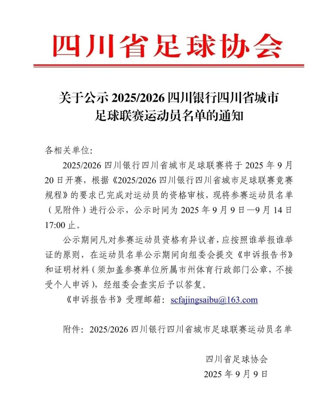 9月9日晚,看度新闻记者从四川省足协获悉,根据《2025/2026四川银行四川省城市足球联赛竞赛规程》的要求,省足协已完成对运动员的资格审核,现将参赛运动员名单(见附件)进行公示,公示时间为2025年9月9日——9月14日17:00止。