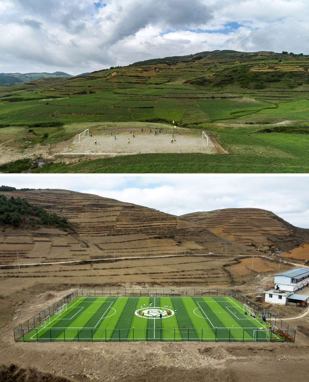 拼版照片:上图为孩子们在瓦吾小学的泥地足球场上训练(2019年5月26日摄);下图为瓦吾小学的女足队员们在“玫瑰梦想球场”上训练(2023年3月3日摄)。新华社记者 沈伯韩 摄