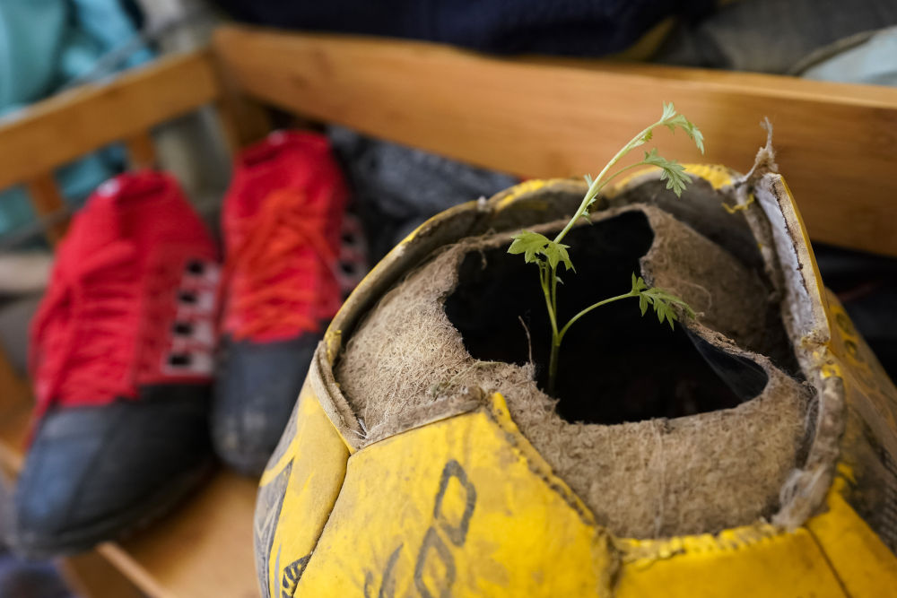瓦吾小学男生宿舍的木架子上,孩子们在一个踢破的足球里装上泥土,种了小小的绿植。只有踢比赛时才穿的新球鞋摆放在一旁。新华社记者 沈伯韩 摄