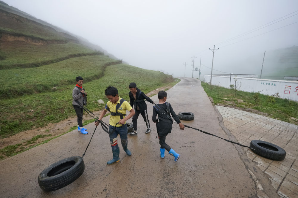2019年5月27日,瓦吾小学足球队员在学校前的水泥路上准备拉着用废旧轮胎自制的装备进行体能练习。新华社记者 沈伯韩 摄