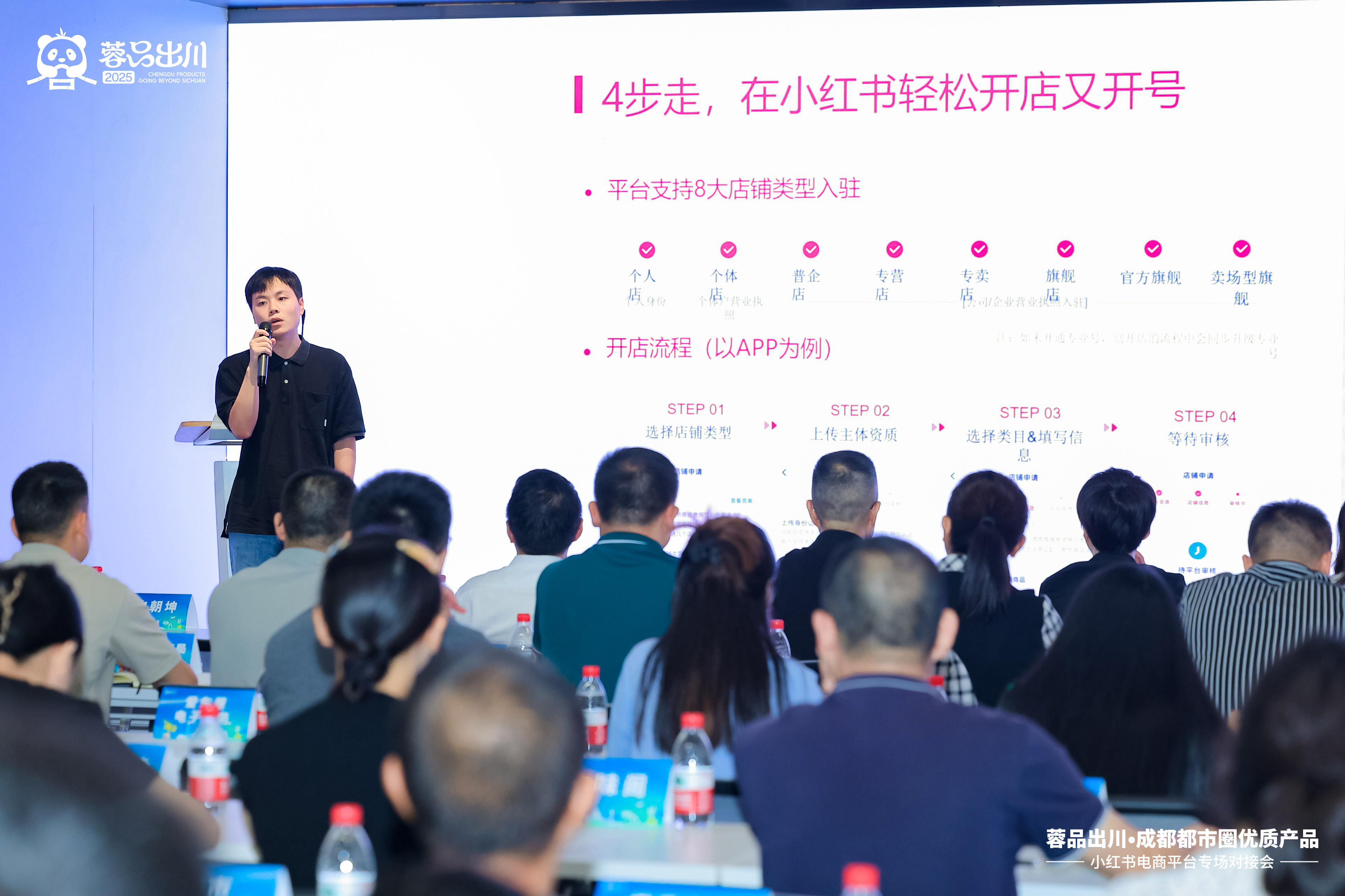 现场活动还包括企业推介和自由交流环节。此外为了让成都都市圈企业更好地理解和运用平台,平台电商团队在现场进行了详尽的分享,不仅深入剖析了当前生鲜农产品等行业品类的线上经营趋势,还拆解了多个成功的商家案例。其中还重点介绍了“百万免佣计划”和专属流量扶持等优惠政策,并讲解了平台独特的“立人设、拍过程、开直播”的“商家经营三板斧”方法论,以及“笔记-直播-群聊”联动的经营模式 ,为生鲜农产品等优质产品注重源头和过程展示的品类提供了极佳的运营思路。据介绍,平台用户对四川本地特产有着极高的关注度,“四川李子”、“攀枝花芒果”、“冷吃兔”等均为热搜词,这为商家提供了天然的流量基础。