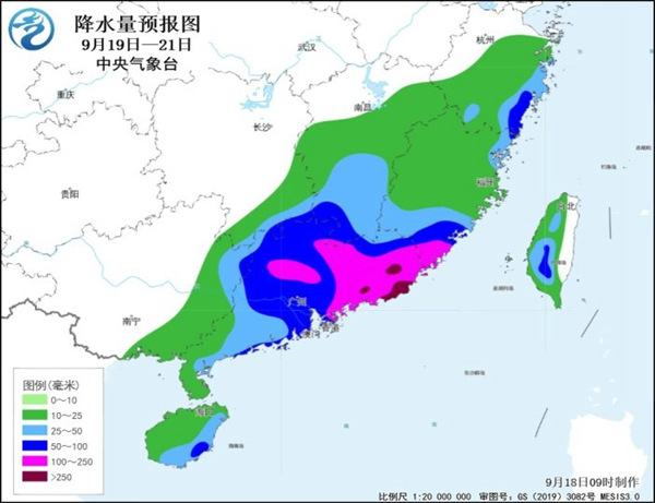 中央气象台预计,19日至21日,广东、福建南部、江西南部、湖南东南部、广西东部、海南岛东部和南部等地有大到暴雨,广东中东部、福建东南部的部分地区有大暴雨,局地有特大暴雨,部分地区累计降雨量120至200毫米,广东东部沿海局地可达250至400毫米,主要降雨时段在19日白天至20日夜间。同时,南海东北部海域有6至7级、阵风8级大风,部分海域风力可达8至9级、阵风10至11级。