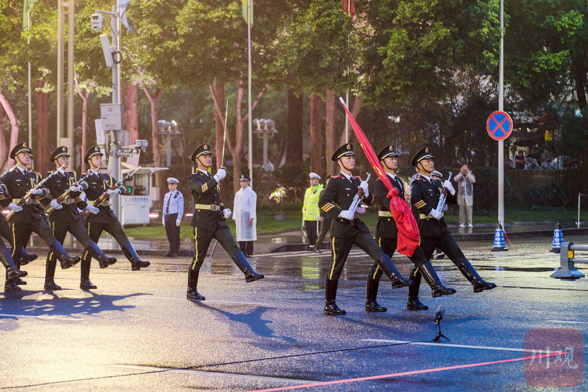 6时50分许,一阵铿锵有力的脚步声打破宁静,升旗手迈着整齐划一的步伐进入天府广场。他们身着笔挺的制服,肩扛国旗,眼神坚定,从广场一侧走向升旗台。