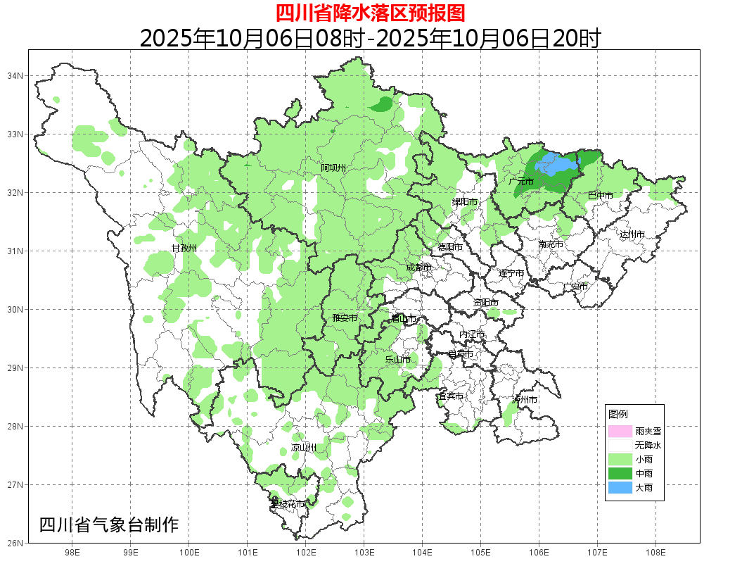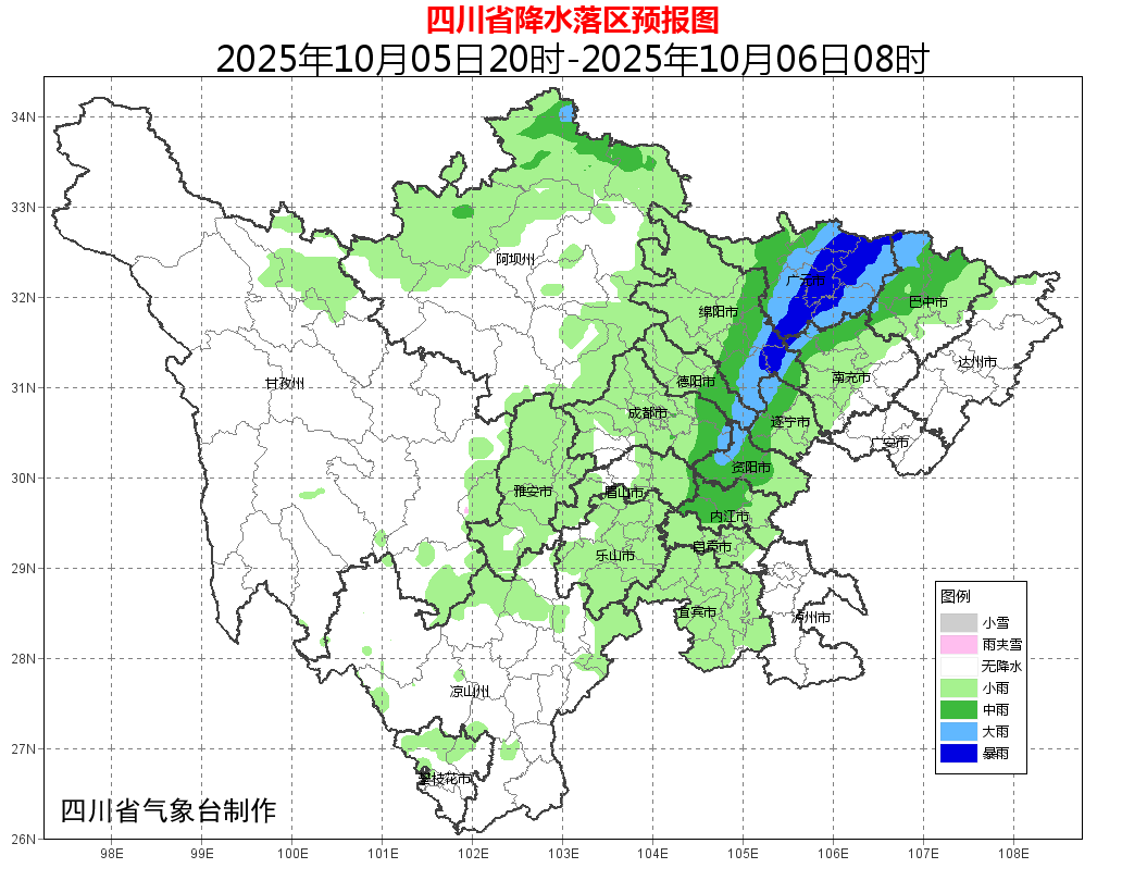 其中,今天晚上到明天白天,盆地阴天间多云,部分地方有阵雨或小雨,广元市和绵阳、德阳、成都3市东部及巴中、南充、遂宁、资阳4市西部的部分地方有中到大雨,局部暴雨,个别大暴雨;川西高原和攀西地区多云间阴有分散阵雨,其中阿坝州北部局部有中雨,个别大雨。气象部门提醒,盆地西部局部地方累积雨量较大,需加强防范地质灾害、中小河流山洪等气象次生灾害的不利影响。