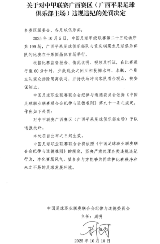 10月10日,中国足球职业联赛联合会(以下简称中足联)在官网针对10月5日本赛季中甲联赛第25轮广西平果队主场与重庆铜梁龙队比赛连续发布三份处罚决定。重庆铜梁龙队员黄希扬、广西平果队主教练前田浩二以及广西赛区(广西平果足球俱乐部主场)分别受到处罚。
