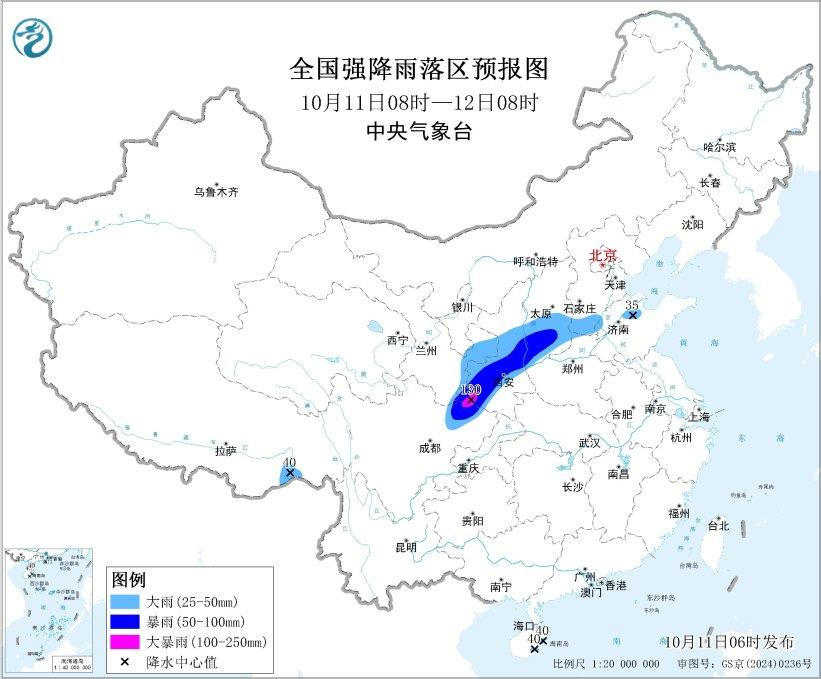 预计,10月11日08时至12日8时,四川盆地西北部、甘肃东部、陕西中部和南部、山西中南部、河北南部、山东北部及海南岛东部、西藏东南部等地部分地区有大到暴雨,其中,陕西南部、四川盆地西北部等地局地有大暴雨(100~130毫米)。