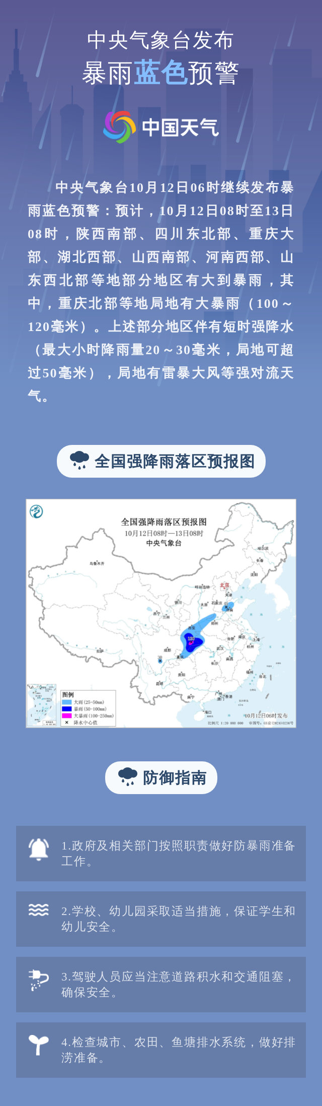 中央气象台10月12日06时继续发布暴雨蓝色预警:预计,10月12日08时至13日08时,陕西南部、四川东北部、重庆大部、湖北西部、山西南部、河南西部、山东西北部等地部分地区有大到暴雨,其中,重庆北部等地局地有大暴雨(100~120毫米)。