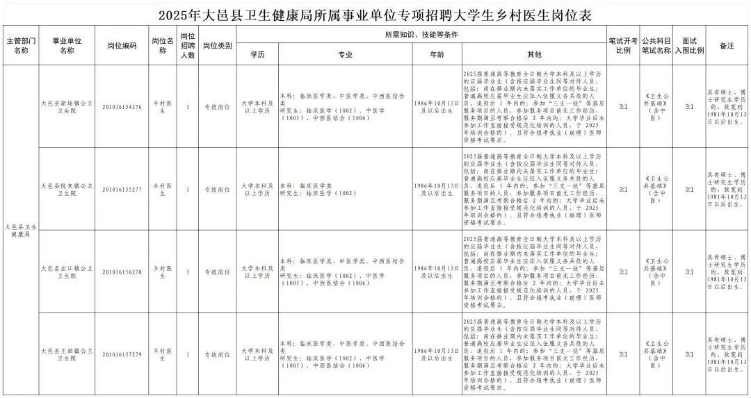 大邑县卫生健康局所属事业单位面向社会公开招聘工作人员4名大学生乡村医生。