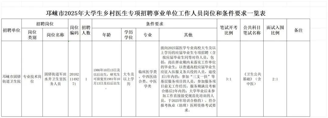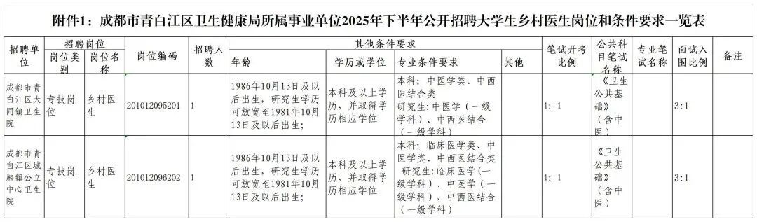 2025年青白江区卫健局所属事业单位公开招聘大学生乡村医生专项计划人员2名。