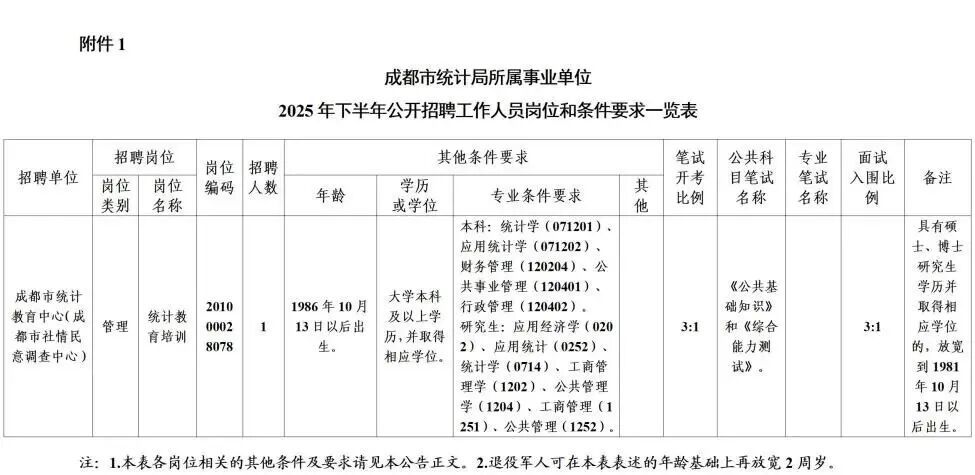 成都市统计局面向社会公开招聘工作人员1名。
