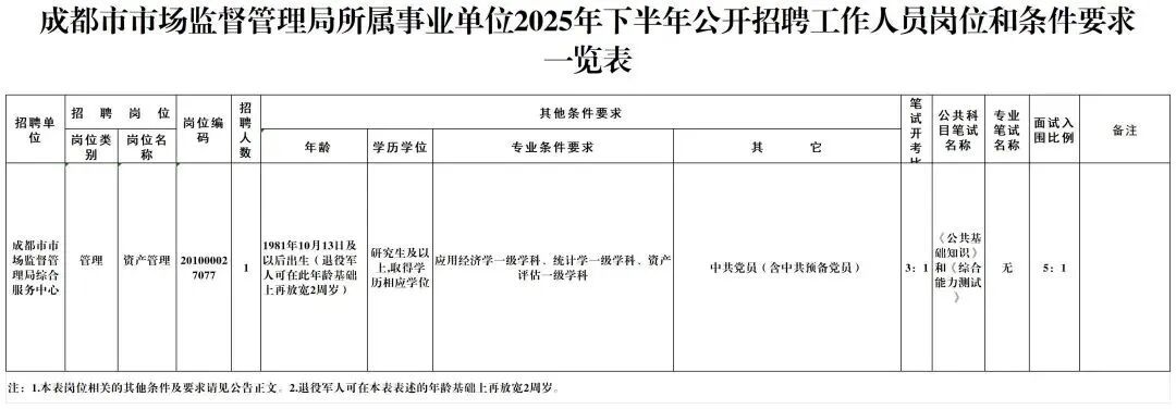 成都市市场监督管理局所属事业单位面向社会公开招聘工作人员1名。