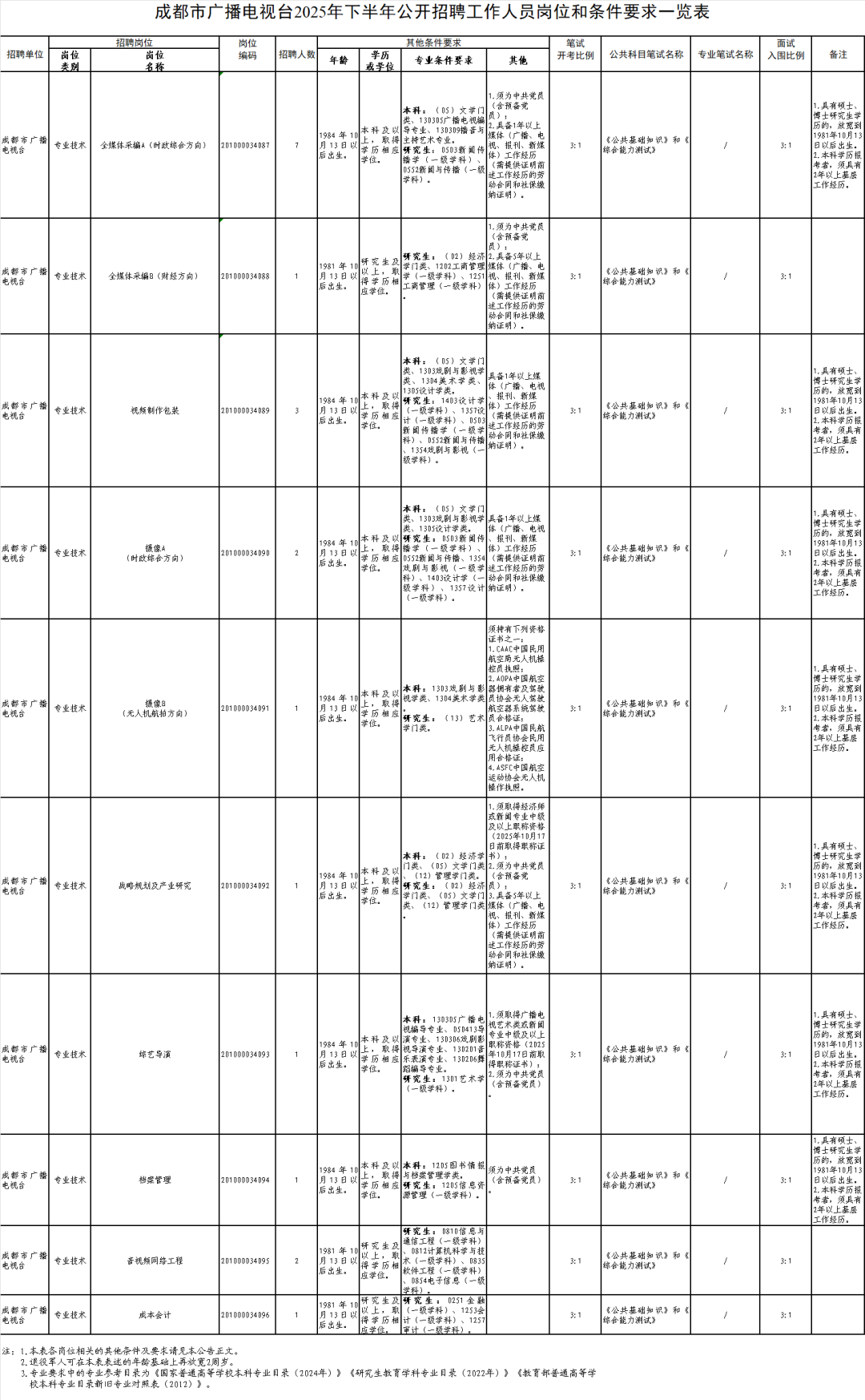 成都市广播电视台面向社会公开招聘工作人员20名。