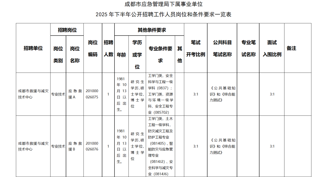成都市应急管理局下属事业单位成都市救援与减灾技术中心面向社会公开招聘工作人员2名。