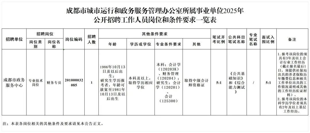 成都市城市运行和政务服务管理办公室面向社会公开招聘工作人员1名。