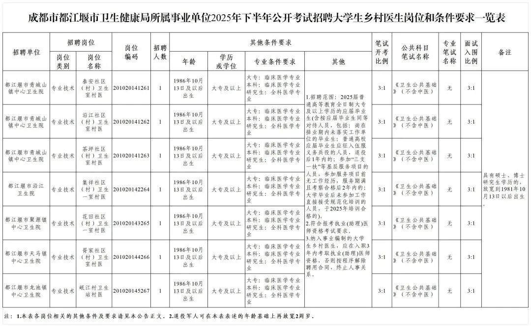 都江堰市卫生健康局(以下简称都江堰市卫健局)所属事业单位面向社会公开考试招聘大学生乡村医生7名。