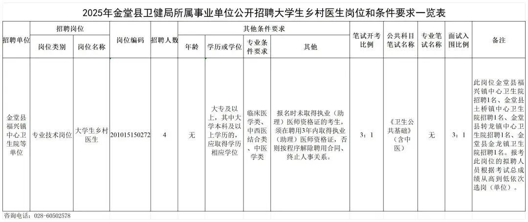 金堂县卫生健康局所属4家事业单位向社会公开招聘工作人员4名。