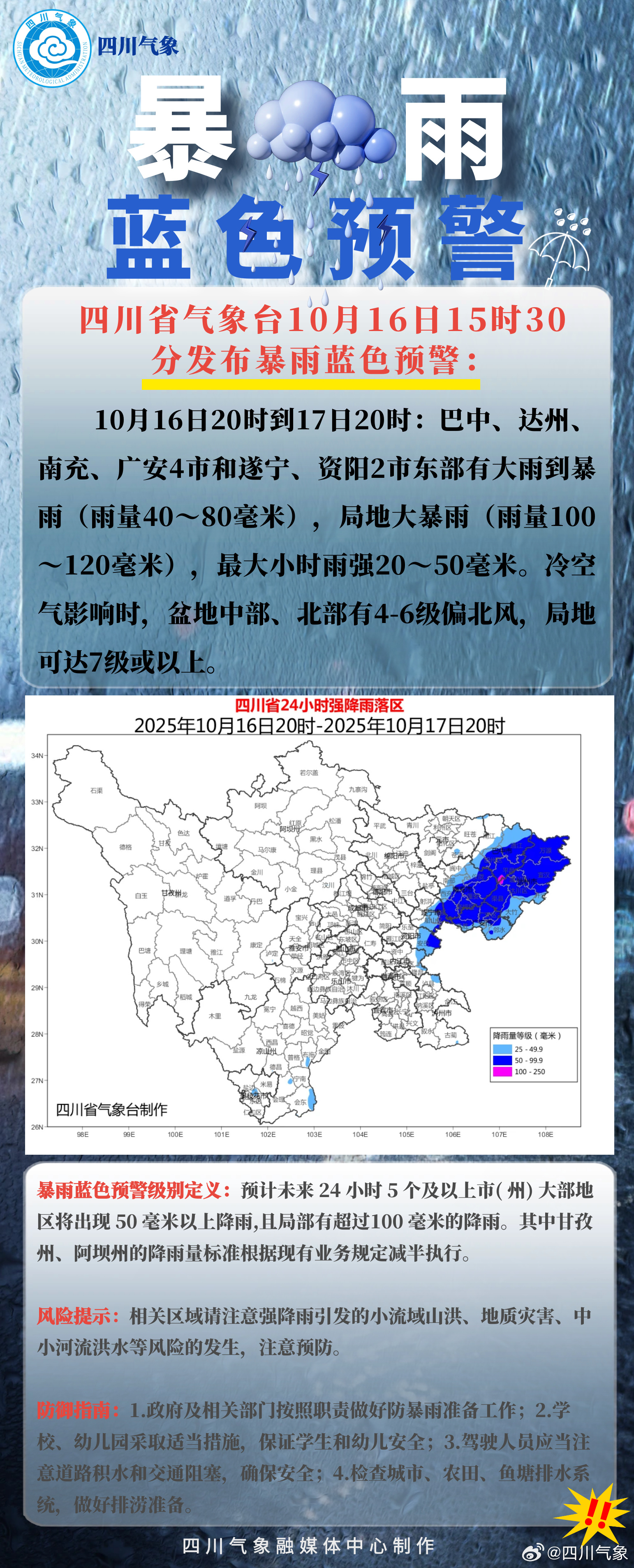 四川省气象台10月16日15时30分发布暴雨蓝色预警: