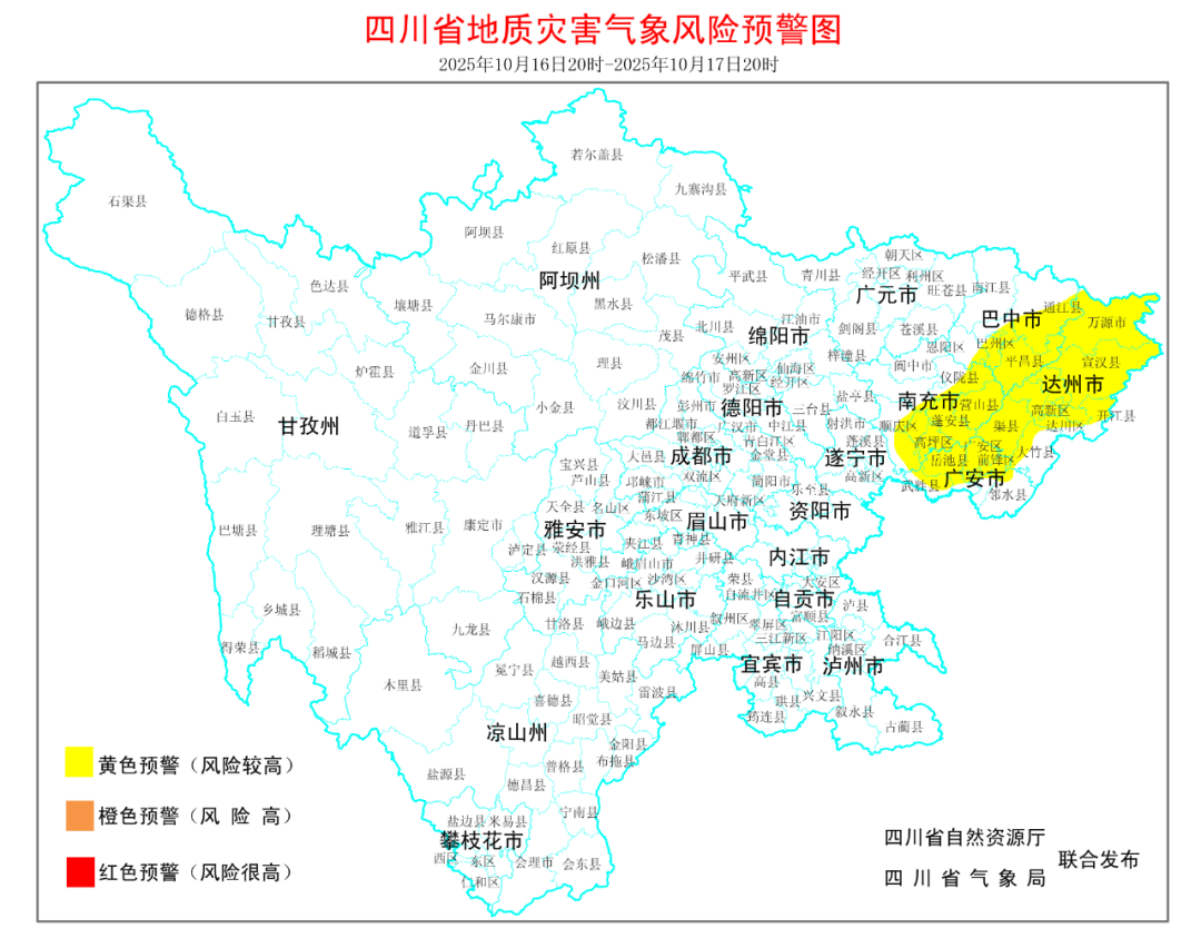 10月16日20时到17日20时:巴中、达州、南充、广安4市和遂宁、资阳2市东部有大雨到暴雨(雨量40~80毫米),局地大暴雨(雨量100~120毫米),最大小时雨强20~50毫米。冷空气影响时,盆地中部、北部有4-6级偏北风,局地可达7级或以上。