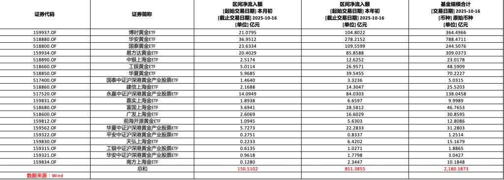 目前市场上有20只黄金主题ETF(包括14只商品型ETF和6只股票型ETF),较好的“赚钱效应”吸引了大量投资者涌入。Wind数据显示,截至10月16日,全市场20只与黄金相关的ETF合计净流入额今年以来已达851.39亿元,最新规模更攀升至2180.19亿元。