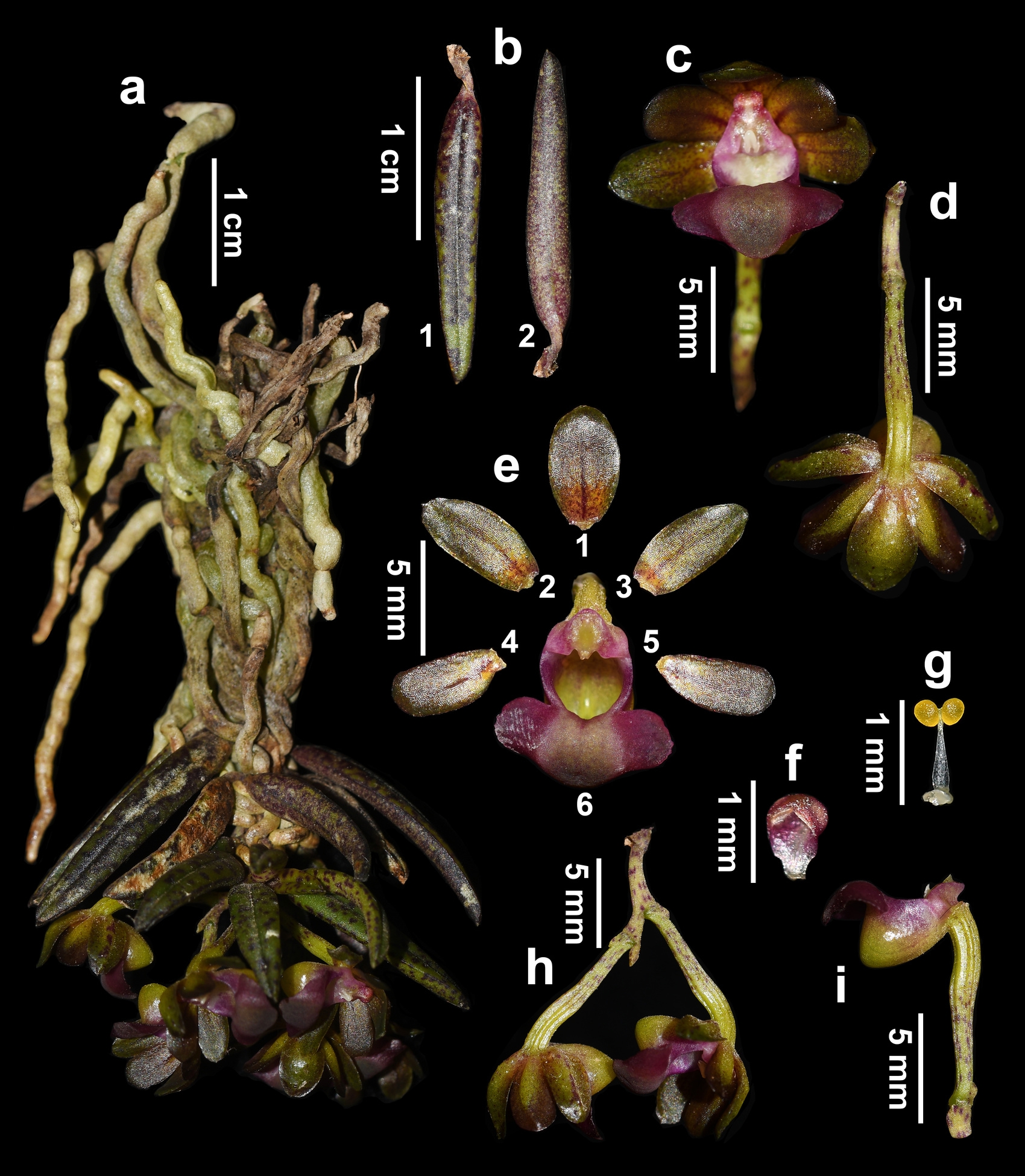 盆距兰属隶属于兰科树兰亚科指甲兰亚族,全球约73种,是一类附生在热带和亚热带山地森林中树木或岩石上的草本植物。该属植物的唇瓣色彩斑斓、结构精巧,具有较高的观赏价值。根据分析,九寨沟盆距兰隶属于盆距兰属列叶组,该种的发现将列叶组的物种数量增加到16种,不仅丰富了物种图谱,更对区域植物生态适应机制研究具有重要价值。