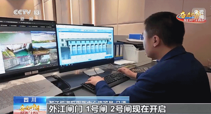 就在我们拍摄的过程当中发现外江的两孔闸门正在缓缓开启,而这个指令就是从距离我两公里以外,“十四五”期间刚刚建设的都江堰灌区指挥中心发出的。