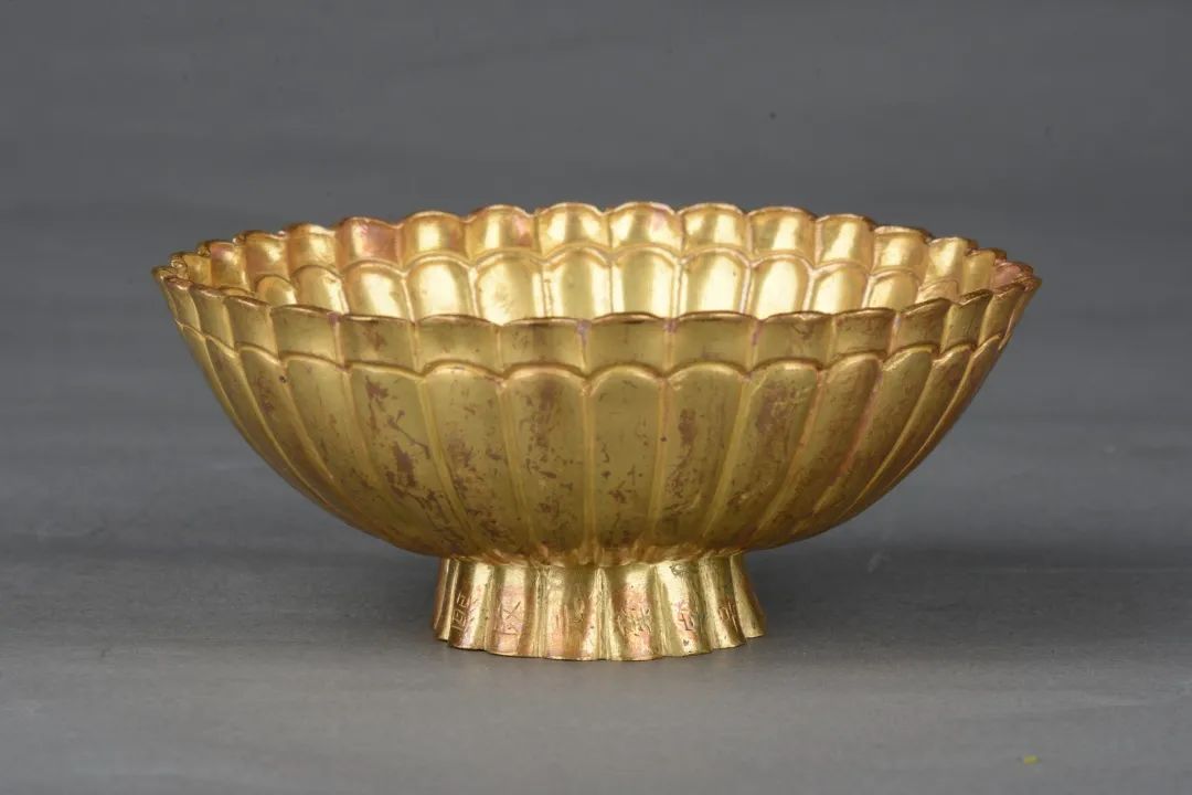 在彭州市博物馆的展柜中,这对瓜形金盏虽历经八百年尘封,依旧泛着温润的金光。它们并非规整的几何造型,而是模仿刚从藤蔓摘下的五棱瓜果,方唇直口,斜腹圜底,连瓜蒂处的五片叶子都叶脉分明,仿佛还带着晨露。