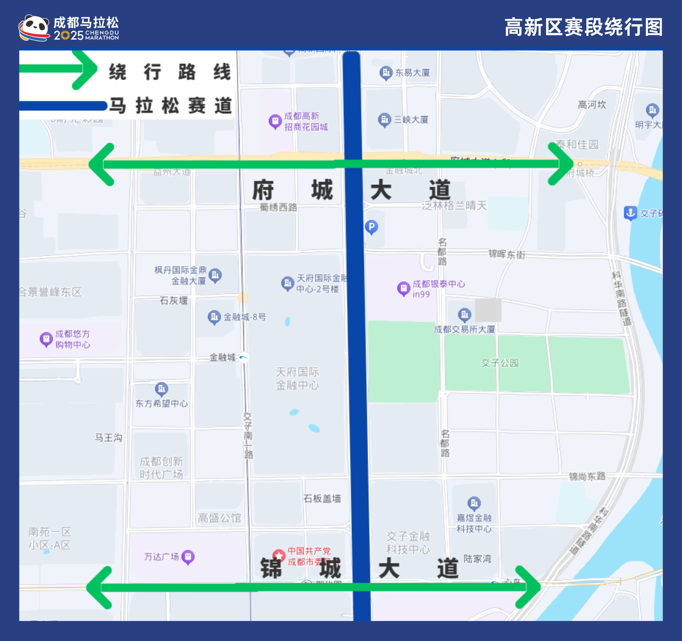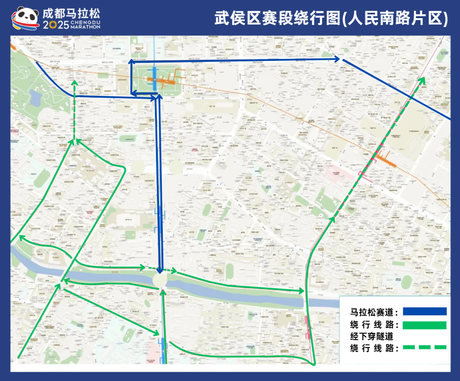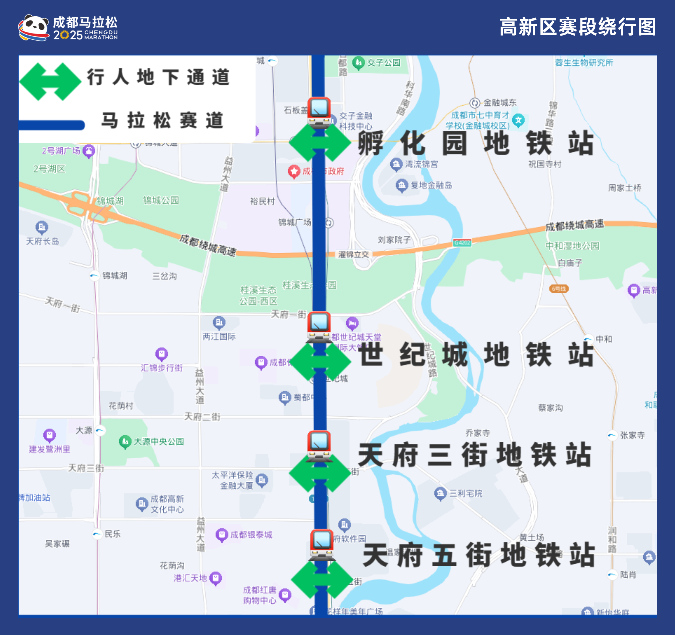 行人可经地铁金沙博物馆站地下通道、地铁文化宫站地下通道、地铁西南财大站地下通道、石人南路人行天桥、地铁草堂北路站地下通道、牧电路人行天桥、浣花北路人行天桥、一环路、十二桥路人行天桥、地铁通惠门站地下通道、地铁天府广场站地下通道、人民南路陕西街地下通道、总府路人行天桥通过赛道。